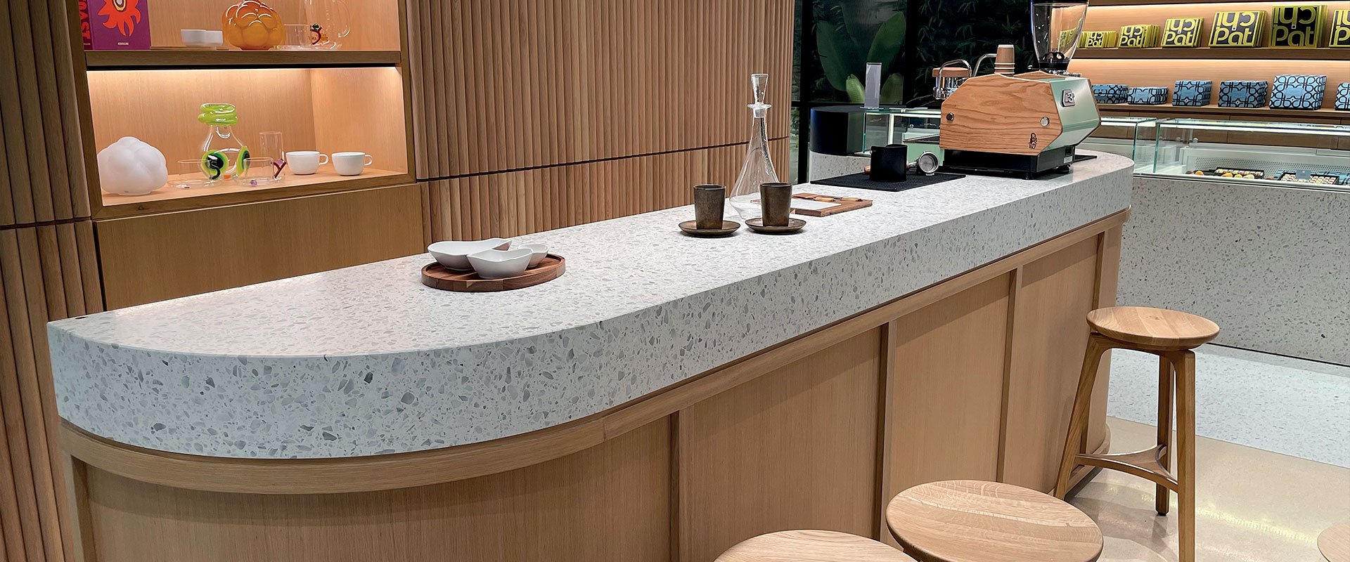Agglotech mermer-çimento aglomeraları, renk, şekil ve bitiş açısından iç ve dış terrazzo zemin kaplamalarının hassas bir şekilde özelleştirilmesine olanak tanır.