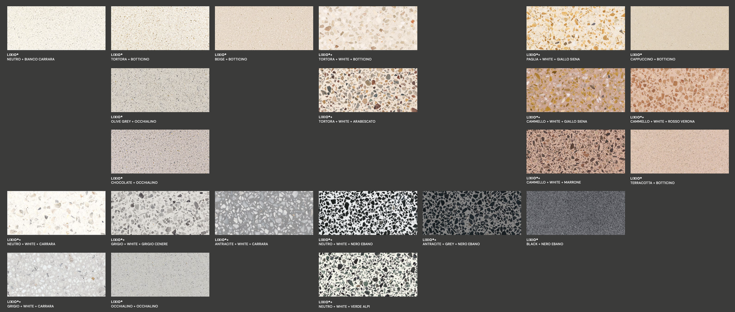 Lixio®+, projenin yerel kaynakları dahil olmak üzere herhangi bir kaynaktan değerli mermer agregalarının kullanılmasına olanak tanır; bu özellik, "Rönesans"ı ve yerel hammaddelerin kullanımını teşvik etmek için çok talep görmüştür. Bu yetenek, sistemin terrazzo ile ilişkilendirilen güzel ve zamansız görünümden vazgeçmeden, yerel çevreye dayanan yeni ve sürdürülebilir bir kalite kazanmasını sağlar.